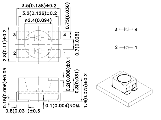 Pouzdro: PLCC4 Barva 1: modrá 465nm Uf: 3.0-3.4V If: 20mA (abs max. 30mA) Iv@20mA: 100-165mcd Barva 2: červená 525nm Uf: 1.9-2.4V If: 20mA (abs max. 30mA) Iv@20mA: 115-180mcd Pd: 72mW Vyzařovací úhel: 120°